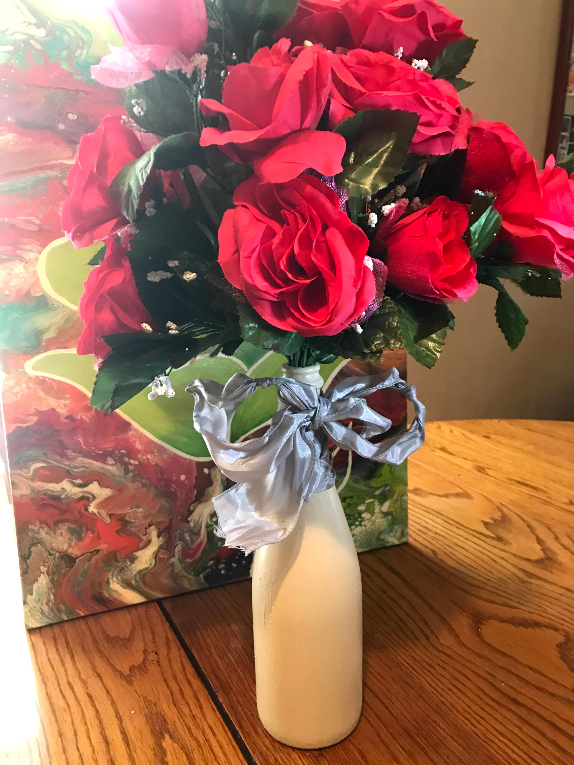 This bottles was hand painted with beige paint - Grey satin wrapping to outline the look of Beige Vibez . - Locally sourced - Hand painted with artificial flowers